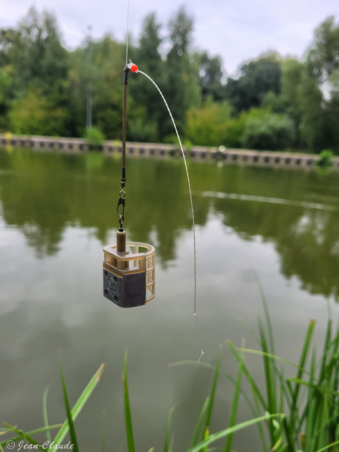 - Matériel : feeder cage 20–30 g, hameçon n°16 avec asticot.