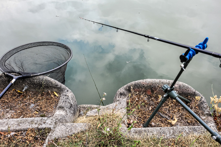 Pour le support de canne, j’ai improvisé avec les moyens du bord : un bras coudé fixé à ma station de pêche au coup, sur lequel j’ai vissé un vieux repose-canne en forme de cœur. Un modèle d’un autre temps, que je ne suis même pas sûr de retrouver encore dans le commerce ! 🤔