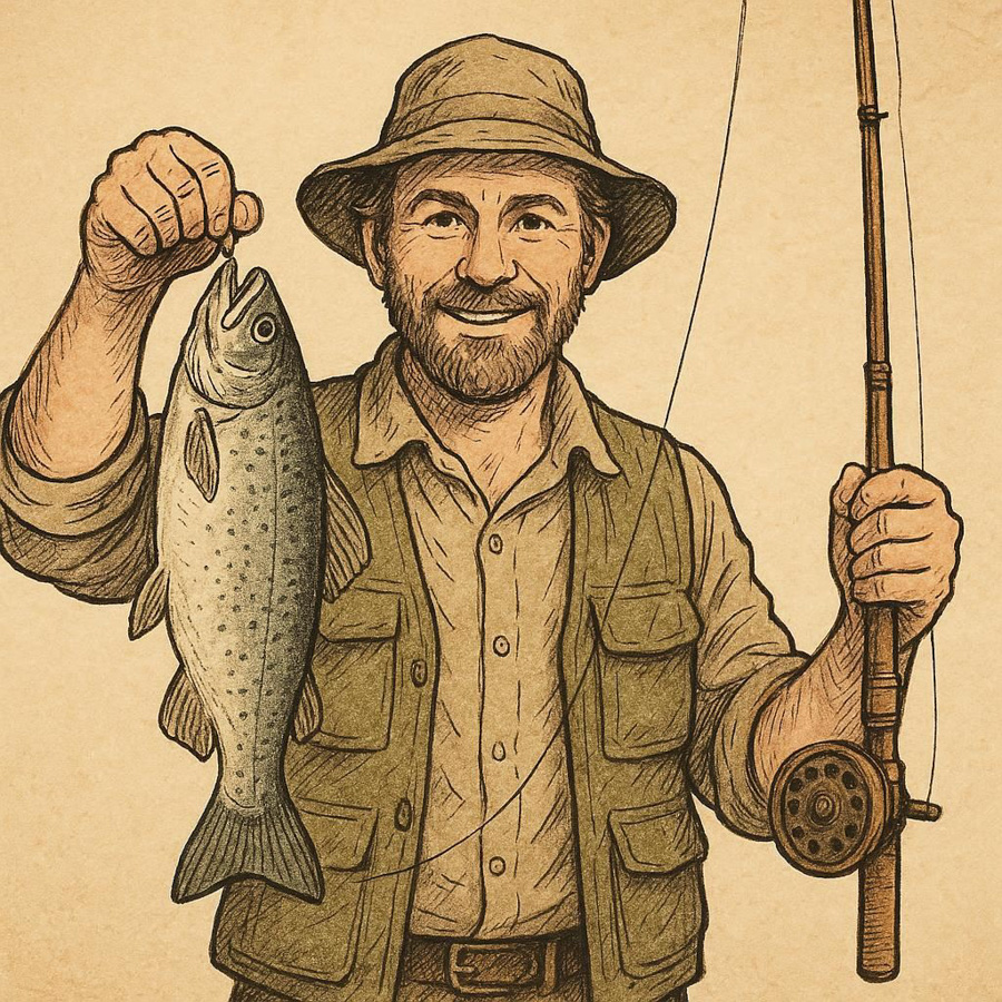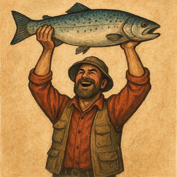 - Le pĂȘcheur tenant le poisson dâune main et la canne de lâautre â Pour raconter lâhistoire complĂšte de la capture.