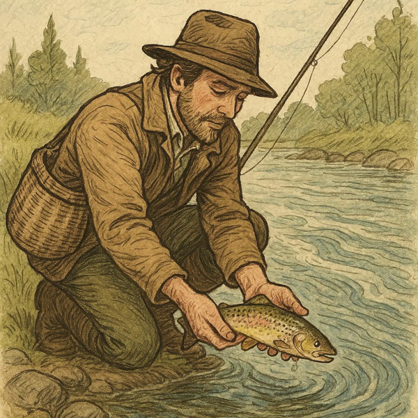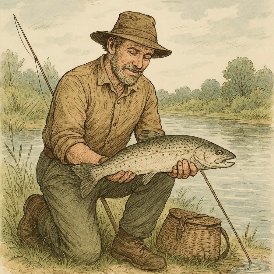 - Le pĂȘcheur en train de relĂącher sa prise â IdĂ©al pour une photo Ă©thique de pĂȘche en no-kill.