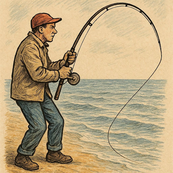 - Le pĂȘcheur en action (canne pliĂ©e, fil tendu) â Capture lâeffort et lâĂ©motion de la prise.