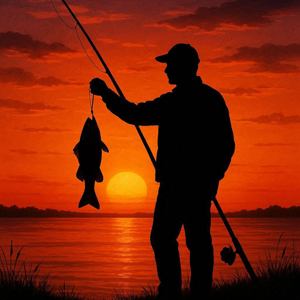 - Silhouette du pĂȘcheur au coucher du soleil avec sa prise â Un effet dramatique et esthĂ©tique.