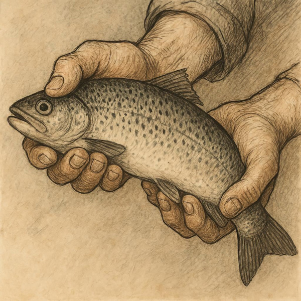 - Plan rapprochĂ© sur les mains tenant le poisson â Met en avant les dĂ©tails du poisson.